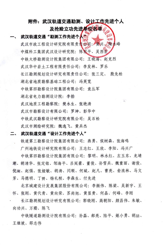 鑒于我公司在武漢市軌道交通3號線香惠區(qū)間地面塌陷搶險工作中的突出表現(xiàn),武漢地鐵集團(tuán)有限公司建設(shè)事業(yè)總部授予我公司等6家勘察、設(shè)計單位“搶險立功先進(jìn)單位”榮譽稱號。其中我公司在各單位中排在第一位。為激發(fā)武漢交通勘測、設(shè)計單位技術(shù)管理骨干的責(zé)任心和榮譽感,授予我公司羅坤、彭華中2位同志武漢軌道交通“勘測先進(jìn)個人”。(巖土一公司)