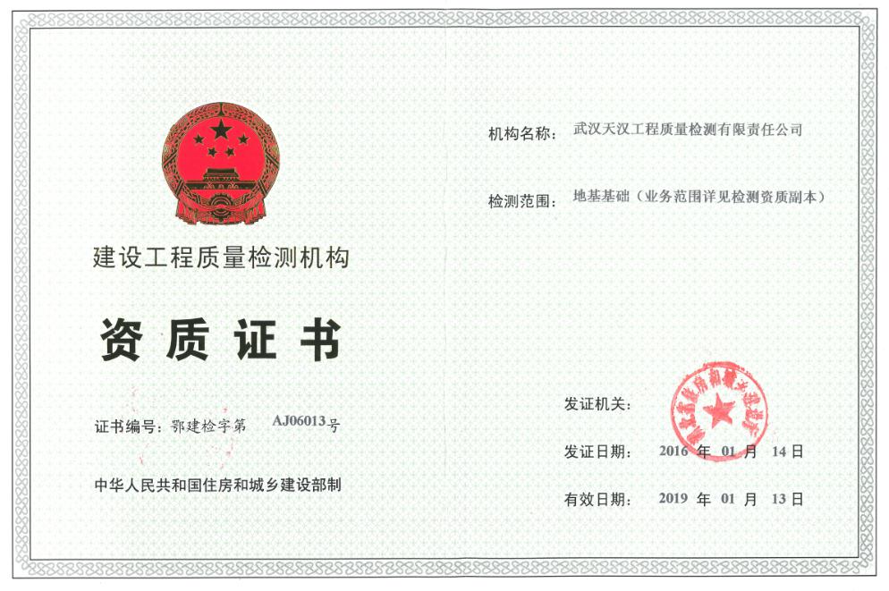 在公司領(lǐng)導(dǎo)的指導(dǎo)關(guān)心下,2016年1月14日,武漢天漢工程質(zhì)量檢測有限責(zé)任公司順利通過省住建廳資質(zhì)延期換證工作,并于2016年1月27日順利完成檢測資質(zhì)增加檢測參數(shù)工作。本次主要增加了建(構(gòu))筑物變形監(jiān)測及基坑監(jiān)測等檢測參數(shù),為天漢檢測公司大力拓展變形監(jiān)測類業(yè)務(wù)墊定了堅實的基礎(chǔ)。(檢測測試中心)
