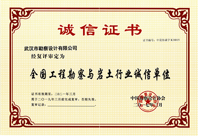 在公司領(lǐng)導(dǎo)和各部門(mén)的大力支持下,經(jīng)過(guò)公司生產(chǎn)經(jīng)營(yíng)部精心的組織和認(rèn)真準(zhǔn)備,我公司順利通過(guò)中國(guó)勘察設(shè)計(jì)協(xié)會(huì)的復(fù)審,順利成為湖北省首批獲得“全國(guó)工程與巖土行業(yè)誠(chéng)信單位”的企業(yè)。