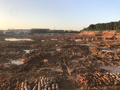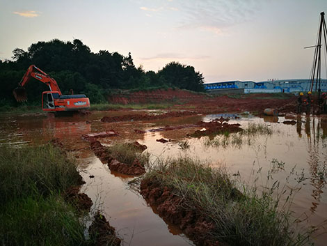 自設(shè)備進(jìn)場(chǎng),9月下旬至10月上旬,咸寧市又遭遇了連續(xù)降雨天氣,場(chǎng)地濕滑,地表滿布淤泥,施工條件極差,進(jìn)駐現(xiàn)場(chǎng)后,現(xiàn)場(chǎng)負(fù)責(zé)人及時(shí)調(diào)配三組水泵、挖機(jī)等場(chǎng)地整理設(shè)備,對(duì)現(xiàn)場(chǎng)的泥水,淤泥進(jìn)行全面的清理整平工作,以保證鉆探施工正常作業(yè)。但連續(xù)陰雨天氣的影響,導(dǎo)致場(chǎng)地不斷積存大量泥水,而武漢市勘察設(shè)計(jì)有限公司承擔(dān)的咸寧高新區(qū)(甘魯片區(qū))棚改項(xiàng)目施工勘察項(xiàng)目的外業(yè)鉆探還在堅(jiān)持作業(yè)。項(xiàng)目現(xiàn)場(chǎng)負(fù)責(zé)人同鉆機(jī)班組一道攻堅(jiān)克難、櫛風(fēng)沐雨,在泥水中作業(yè),雨鞋、衣服滿是泥漬。