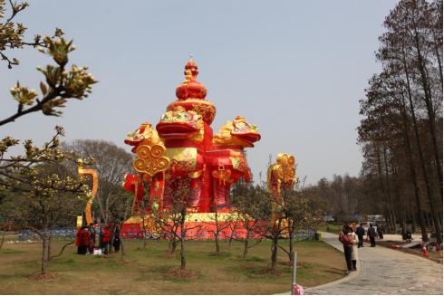 2018年東湖燈會于2月23日至3月31日在武漢市東湖聽濤風(fēng)景區(qū)梨園舉辦。自開幕以來,燈組“雄獅賀歲”一直備受關(guān)注,多次在各大電視欄目以及報紙頭版刊發(fā),“雄獅賀歲”燈組構(gòu)圖有創(chuàng)意,以四面雄獅為設(shè)計主體,周圍環(huán)繞著6柄玉如意,燈組頂端是一個和平寶尊,寓意世界太平、吉祥如意。