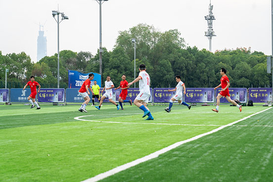 隨著開場的一聲哨響,雙方隊員迅速投入到比賽中,搶斷、過人、射門、撲救……精彩場面一個接一個,場下的啦啦隊和觀眾也被場上隊員的頑強拼搏精神所感染,不時發(fā)出歡呼和喝彩之聲。在將近90分鐘的比賽中,雙方隊員你追我趕,奮力馳騁,盡情享受著足球給大家?guī)淼臉啡。雖然僅僅是一場友誼賽,但是雙方隊員在場上所體現出來的拼搏精神和對比賽的專注態(tài)度并不亞于任何職業(yè)選手。17時,隨著主裁判的一聲哨響,球賽比分定格2:1,公司一球小勝,本次足球友誼賽取得圓滿成功。